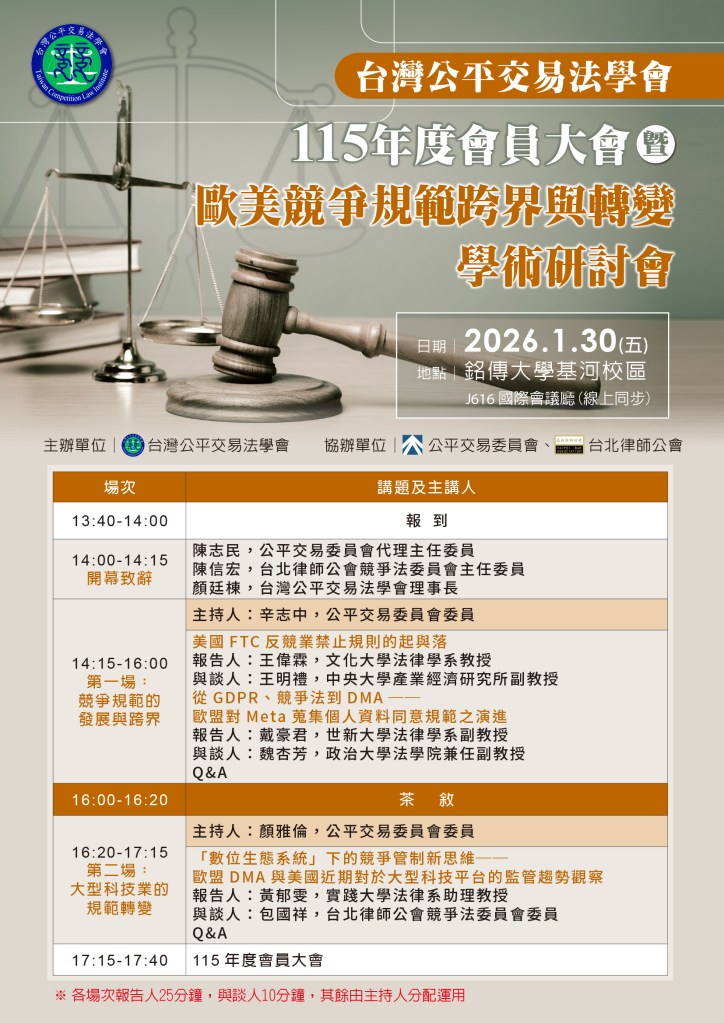 - 【本會主辦」(1月30日)115年度會員大會暨「歐美競爭規範跨界與轉變」學術研討會本會115年度會員大會暨「歐美競爭規範跨界與轉變」學術研討會,訂於2026年1月30日週五繼續閱讀 “【本會主辦」(1月30日)115年度會員大會暨「歐美競爭規範跨界與轉變」學術研討會"