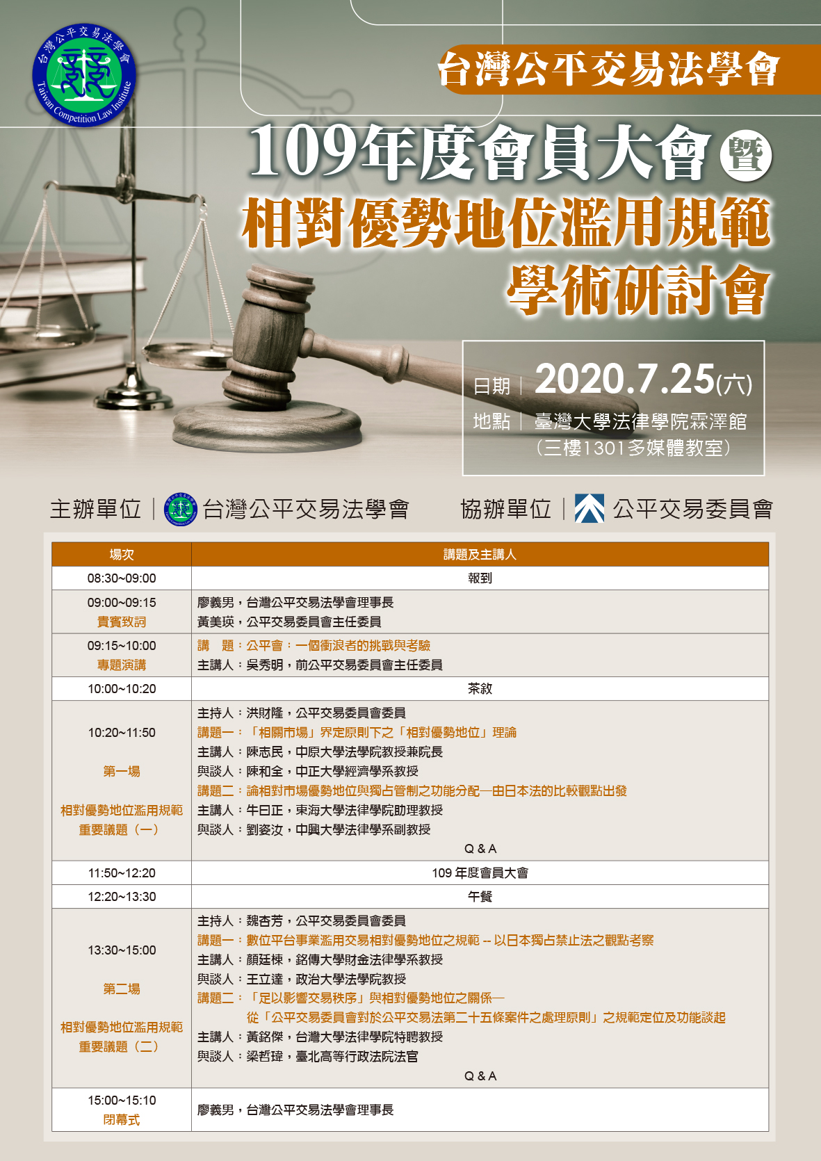 - (2020年07月25日)台灣公平交易法學會109年度第一次學術研討會暨會員大會(因Covid-19疫情延期)
