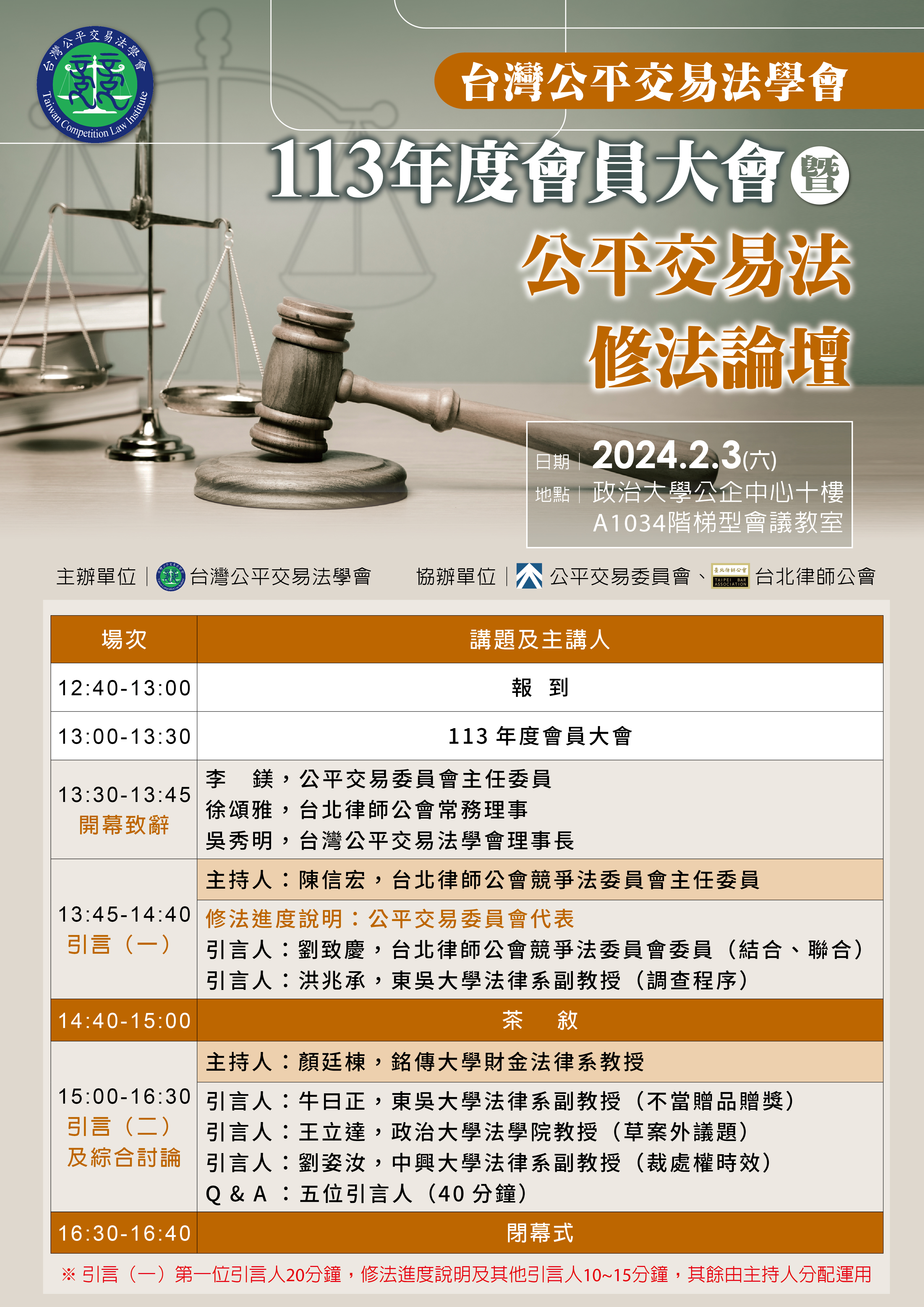 - 【本會主辦】2026年1月30日(五)下午於銘傳大學基河校區 J616 國際會議廳舉辦115年度會員大會暨「歐美競爭規範跨界與轉變」學術研討會
